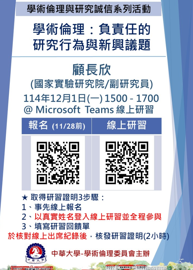 一、本校114年學術倫理與研究誠信系列活動資訊如下: 1、時間:114年12月1日(一)15:00至17:00 2、地點:Microsoft Teams 線上研習 (連結 https://x.chu.edu.tw/AVX2EJ/ ) 3、題目:學術倫理:負責任的研究行為與新興議題 4、講師:國家實驗研究院-顧長欣副研究員 5、對象:全校教職員工及學生、外校人員限有參與本校計畫案者參加。 二、有意願參加者請於114年11月28日(五)前完成線上報名 (報名連結: https://x.chu.edu.tw/Q3W9NQ/ ),請務必填寫 正確姓名,將以此資料製作研習證明。 三、取得研習證明3步驟: 1、事先線上報名 2、以真實姓名登入線上研習並全程參與 3、填寫研習回饋單,於核對線上出席紀錄後,核發研習證明( 2小時)。遲到或早退恕不核予部分時數。